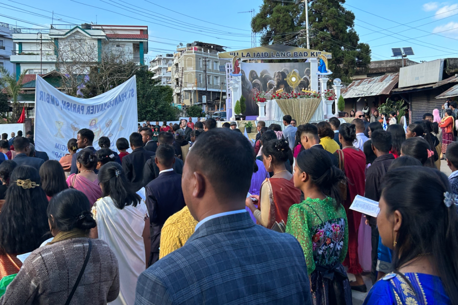 Parishes also organize Eucharistic processions on a smaller scale on different dates, but the diocesan procession has been a major event for at least a century, designed to be a spectacle and a show of unity that attracts Catholics from throughout Meghalaya. In 2024, the year recounted here, several bishops and the papal nuncio to India came to participate.