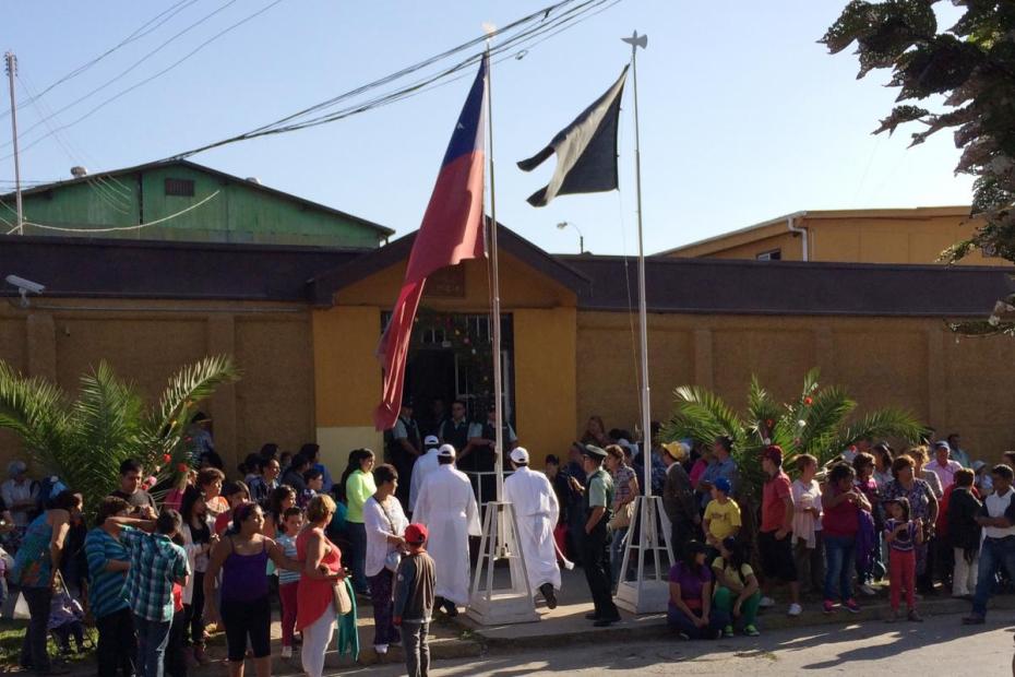 The bulk of the events take place in and in front of the prison. The statue is held by the men so she faces two open windows of the prison, where the Catholic prisoners are supposed to be able to see her. Clergy and bishops go into the prison, pray with the prisoners, and tell them that they are part of the community and that the church prays for them. Loudspeakers project the sound from inside the prison to the crowd outside. The Catholic prisoners sing to the Virgin, and several give speeches. The acolytes take up a collection among the pilgrims for the needs of the prisoners, and the prisoners present the clergy and the Virgin with a gift that they make, usually of wood. In the procession back, the prisoners’ gift is carried aloft back to the church, in front of the bishop and Virgin, who is returned to the church.