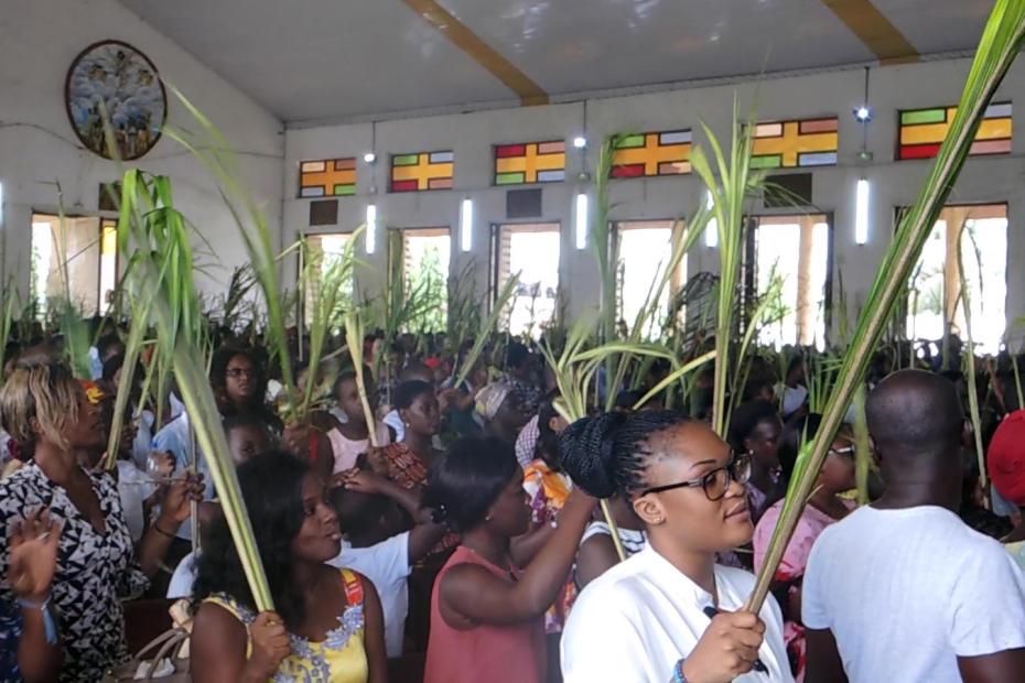 Palm Sunday at St. Ambroise du Jubilé, a large church in Abidjan founded in 2008, ushers in Holy Week in a manner that shows the jubilant side of Ivoirien culture. Parishioners gather at various meeting points in the surrounding neighborhood to walk a kilometer or more to the church. Following a blessing of palms at each starting point, they march to brass accompaniment, many taking dance steps in the process through mostly quiet streets to the church. As group after group enters the church, the joy reaches a crescendo. The crowd fills out into the churchyard and eventually out the property gates. The Palm Sunday liturgy, which could not be videoed, is more restrained, but after the Mass, parishioners move outdoors to wave palms joyfully as they imagine that those who once saw Jesus entering Jerusalem did.