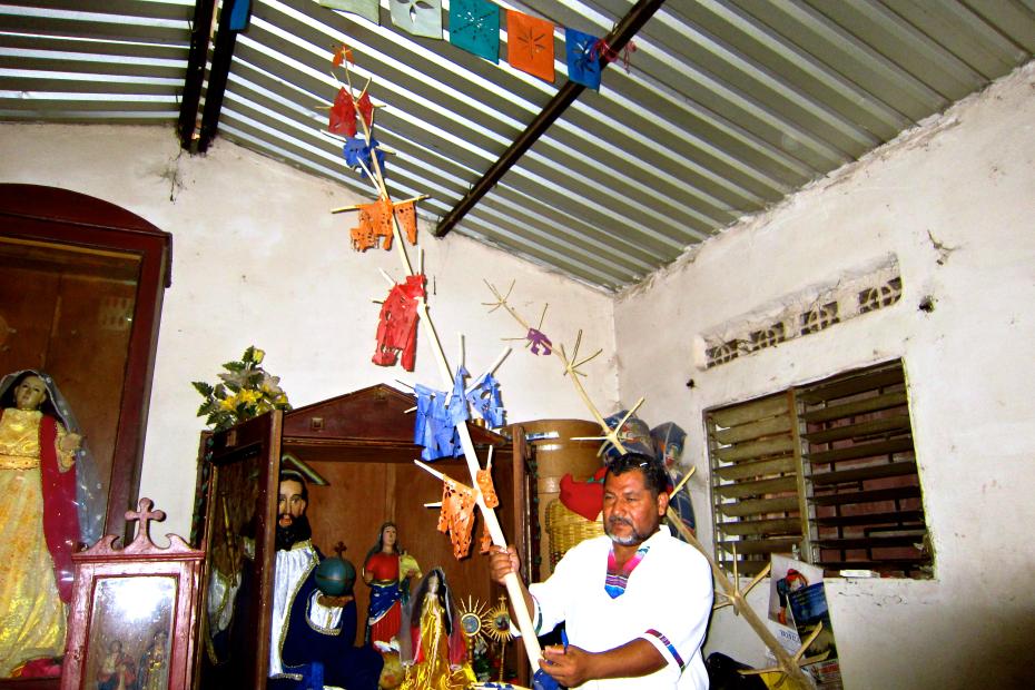 Alonso Garcia, majordomo of the Cofradía Padre Eterno, holds a carved "offering tree" in the style of those that he says was used by indigenous people to hold fruits, corn and other offerings to the shrine.