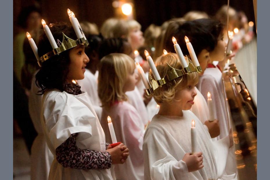 Luciadag, or St. Lucy’s Day, is celebrated today by Danish Christians with a corridor procession of candle-bearing young women dressed in white, led by a young “Lucia bride” wearing a crown or garland of candles. Hymn singing, especially about Santa Lucia, is an important part of the feast.