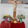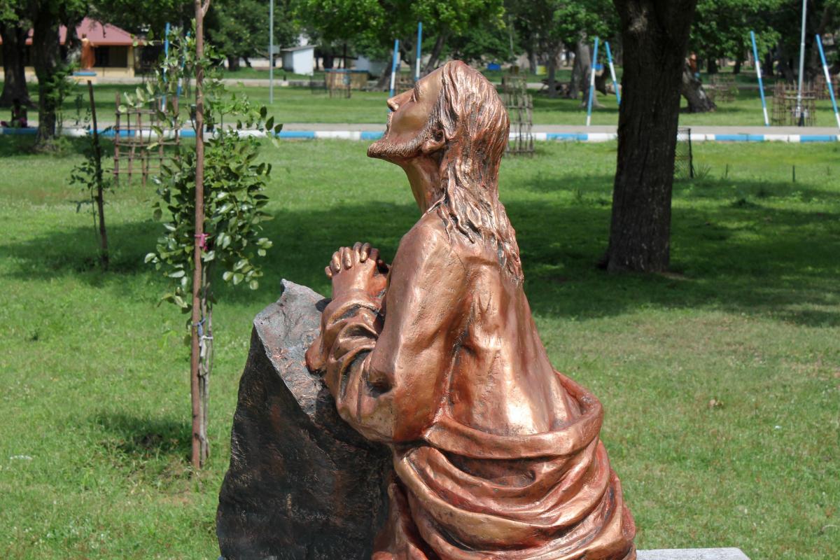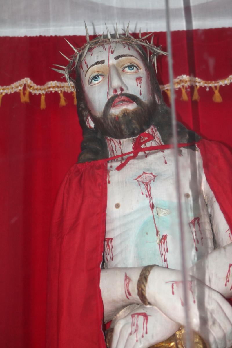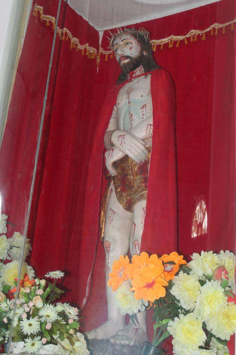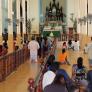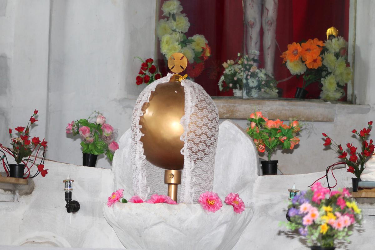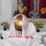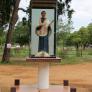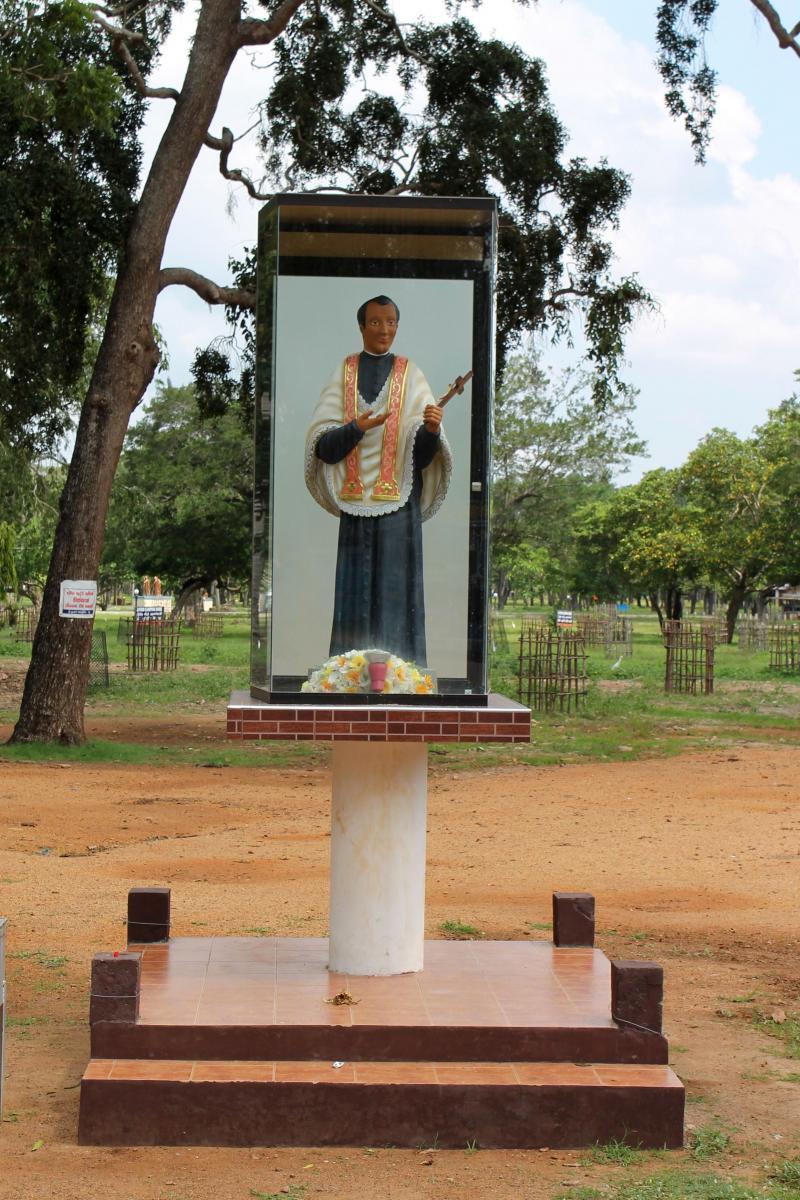 Madhu Church has a large “Ave Maria” sign, along with its transliterations in Sinhala and Tamil. Inside the church, pilgrims walk on their knees to approach Our Lady of Madhu and present their intentions. Flowers are also offered — which interestingly is also characteristic of worship in Buddhist and Hindu temples. Cut into the floor of Our Lady of Madhu Church is a pit that holds soil from the area in which St. Joseph Vaz said Mass while at Madhu. The soil is reputed to have curative properties, and is especially used as an antidote for snakebite. Madhu soil is mixed in concrete for the foundations of Catholic homes, and the soil is sometimes added to water and consumed by pilgrims. Surrounding Madhu Church is a large Way of the Cross. A panoramic view of the area gives a sense of the space needed to accommodate crowds during festivals.