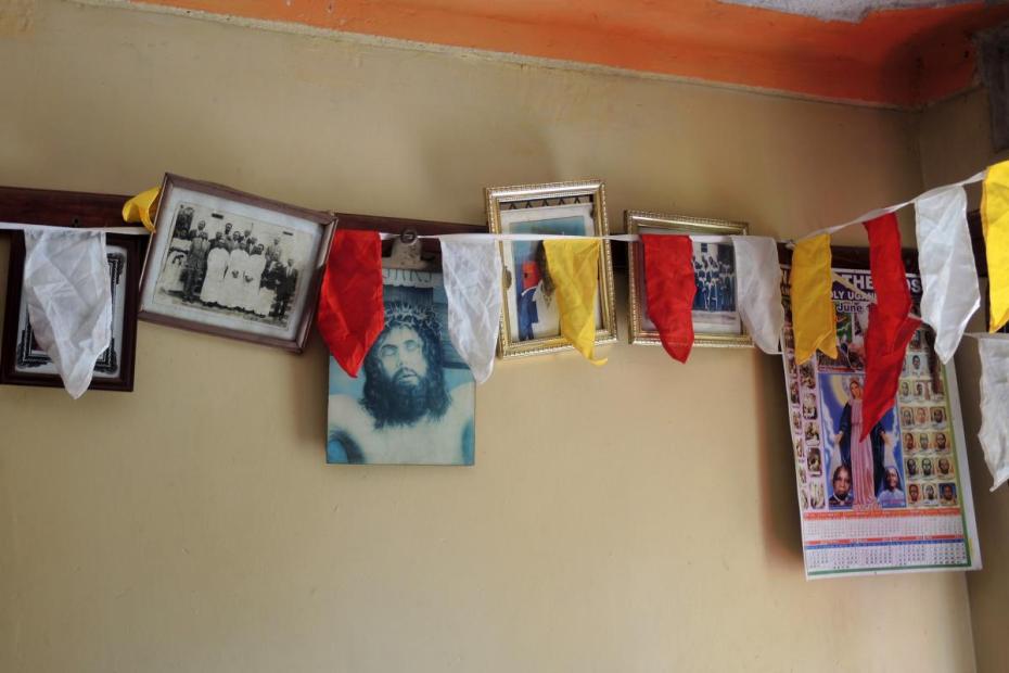 Built on the foundation of traditional African and Catholic legacies, religious practice at home, and religious decoration of homes, is particularly important for Catholics in the area. In that sense, Ugandans clearly do not think of worship as something that happens solely in church on Sunday. One might not be able to tell a Catholic on the streets by way of seeing religious jewelry like a cross, though at church one often sees Catholics wearing rosary beads around their necks. A visit to the public areas of most Catholic homes, though, quickly makes religious identity clear. Religious images in homes often seem to be one of the primary forms of decoration, next to photos of loved ones. Whereas in some cultures religious images tend to be in private rooms or the kitchen, here they are notably visible in public rooms, the same spaces where Catholic families often pray together from scripture or a prayer book in the evening.